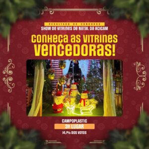 Fotos das 10 melhores vitrines selecionadas foram disponibilizadas no link da promoção para votação popular, encerrada no final da noite desta segunda-feira. “Cada voto representou o olhar da comunidade, valorizando o talento, o cuidado e o empenho das empresas que fizeram do nosso Natal um momento ainda mais especial. A Acicam agradece a todos que participaram da votação e a cada empresa que levou brilho, criatividade e espírito natalino para as ruas de Campo Mourão”, enfatiza o presidente da entidade, Francisco Viudes.
