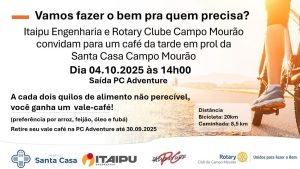 No dia 04 de outubro, um sábado, Campo Mourão será palco de um grande movimento de solidariedade. A Itaipu Engenharia, o Rotary Clube Campo Mourão e os Grupos de Ciclistas da cidade promovem um Café da Tarde Solidário em prol da Santa Casa de Campo Mourão, com o objetivo de arrecadar alimentos não perecíveis destinados à alimentação dos pacientes do hospital.