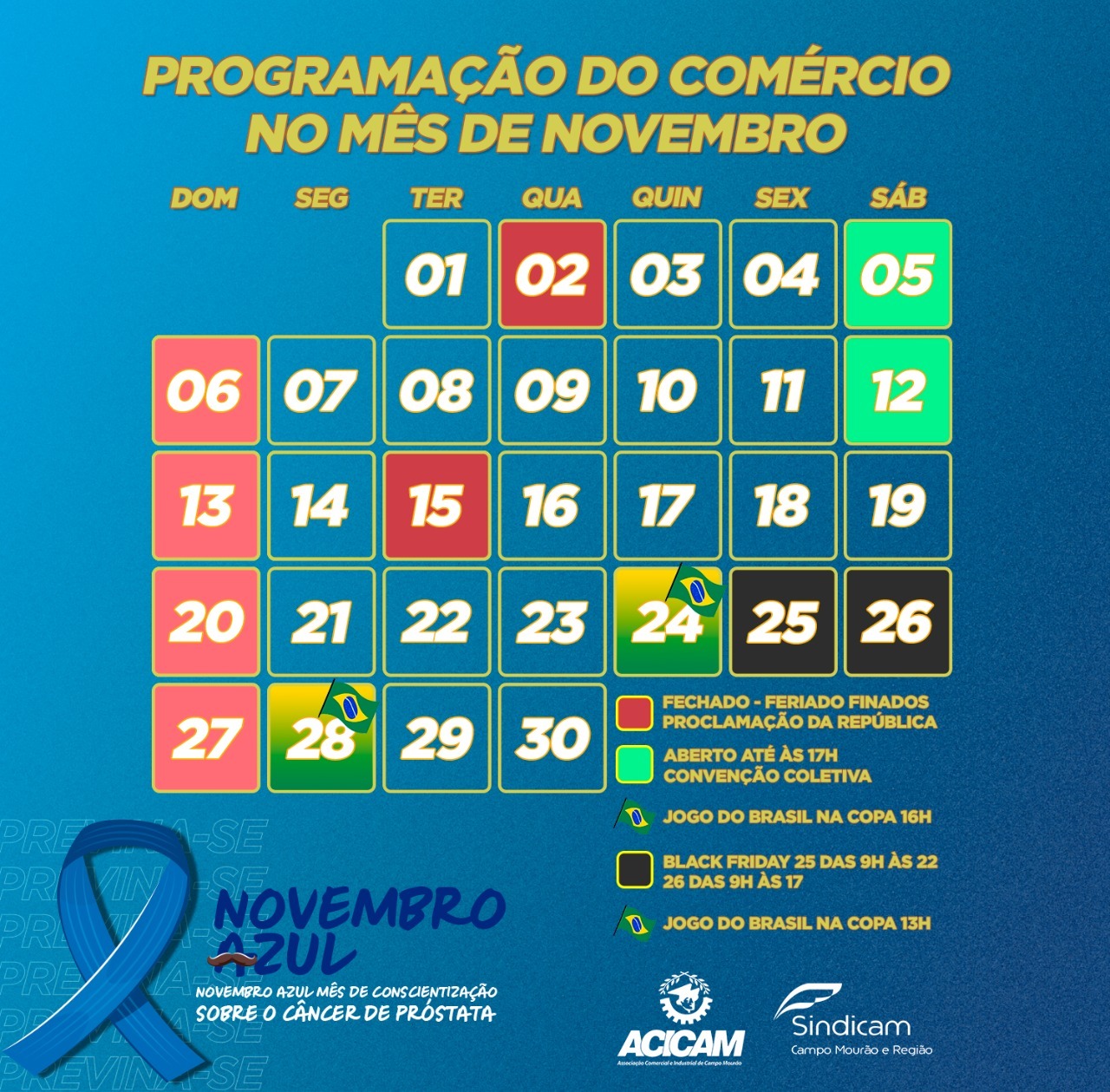 O mês de novembro tem dois feriados nacionais – dia 2/Finados e dia 15/Proclamação da República -, em que o comércio permanecerá fechado. Nos dois primeiros sábados – dias 5 e 12 – o funcionamento do comércio vai se estender até às 17 horas. A Black Friday será nos dias 25 de novembro (sexta feira, com as lojas abertas até às 22 horas) e 26 de novembro (sábado – até às 17 horas). Os jogos do Brasil serão nos dias 24 (16 horas) e 28 (13 horas).