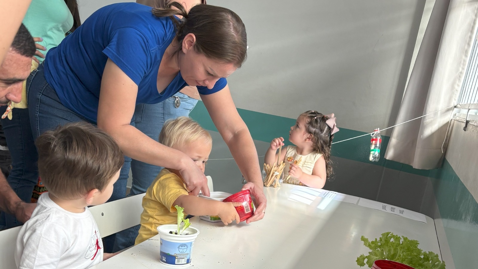 O Centro Municipal de Educação Infantil (CMEI) Santa Cruz promoveu, no último sábado (23), o Concurso Pedagógico de Brinquedos com Materiais Recicláveis, parte do projeto Sementinhas do Futuro – Recriar para Crescer com Sustentabilidade. A iniciativa mobilizou 43 famílias, que apresentaram brinquedos confeccionados a partir de materiais como garrafas PET, caixas de papelão, tampinhas, tecidos e outros itens reaproveitados.