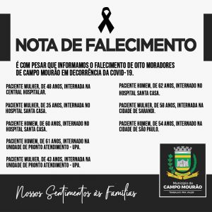 Infelizmente, Campo Mourão teve mais oito mortes por Covid-19. Veja a Nota de Falecimento da Prefeitura (acima). Agora, o Município registra 239 mortes desde o início da Pandemia.
