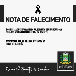 Infelizmente, Campo Mourão teve mais uma morte por Covid-19. Veja a Nota de Falecimento da Prefeitura (acima). Agora, o Município registra 306 mortes desde o início da Pandemia.