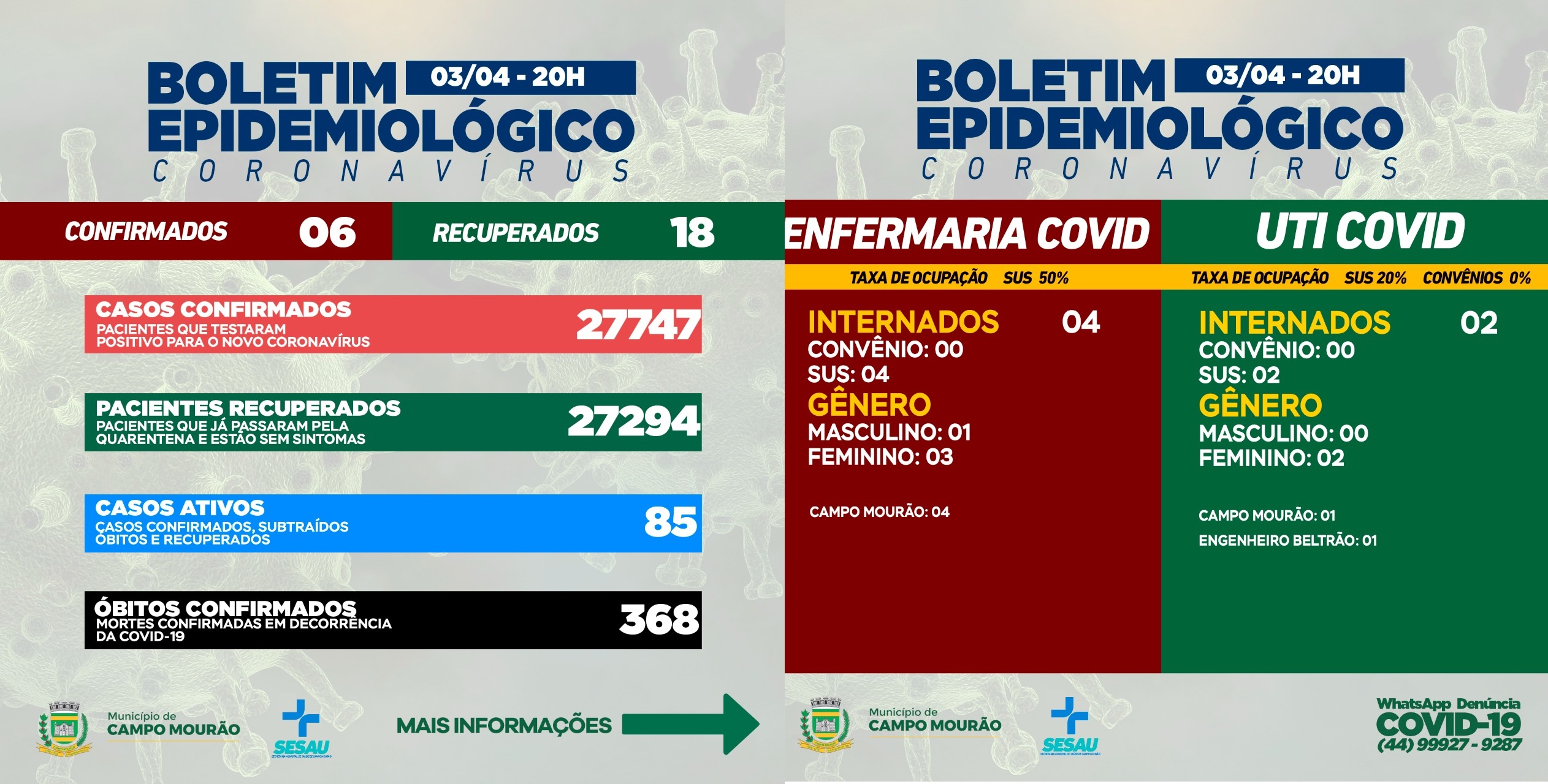 Campo Mourão teve seis casos novos, totalizando 27747 casos de Covid-19 desde o início da pandemia. As informações pertencem ao boletim da Secretaria da Saúde, divulgado neste domingo (3).