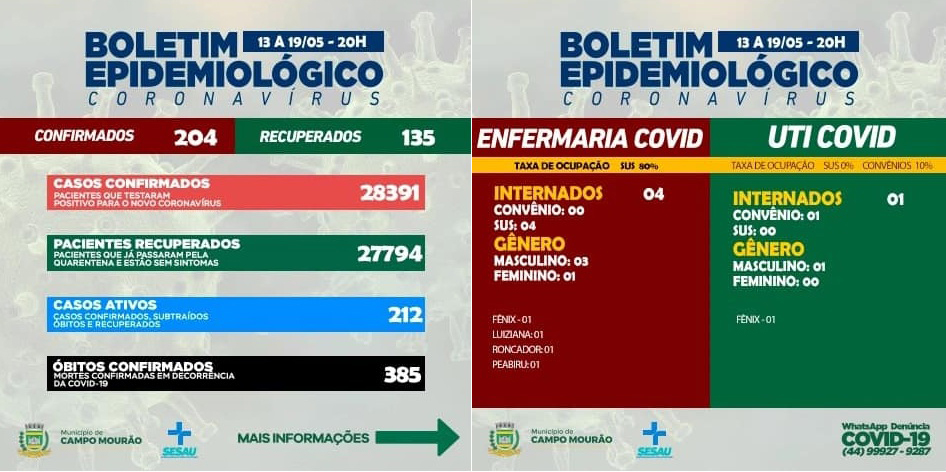 A boa notícia é que no período teve 135 pacientes recuperados, Campo Mourão tem agora 27794 pacientes recuperados da doença.