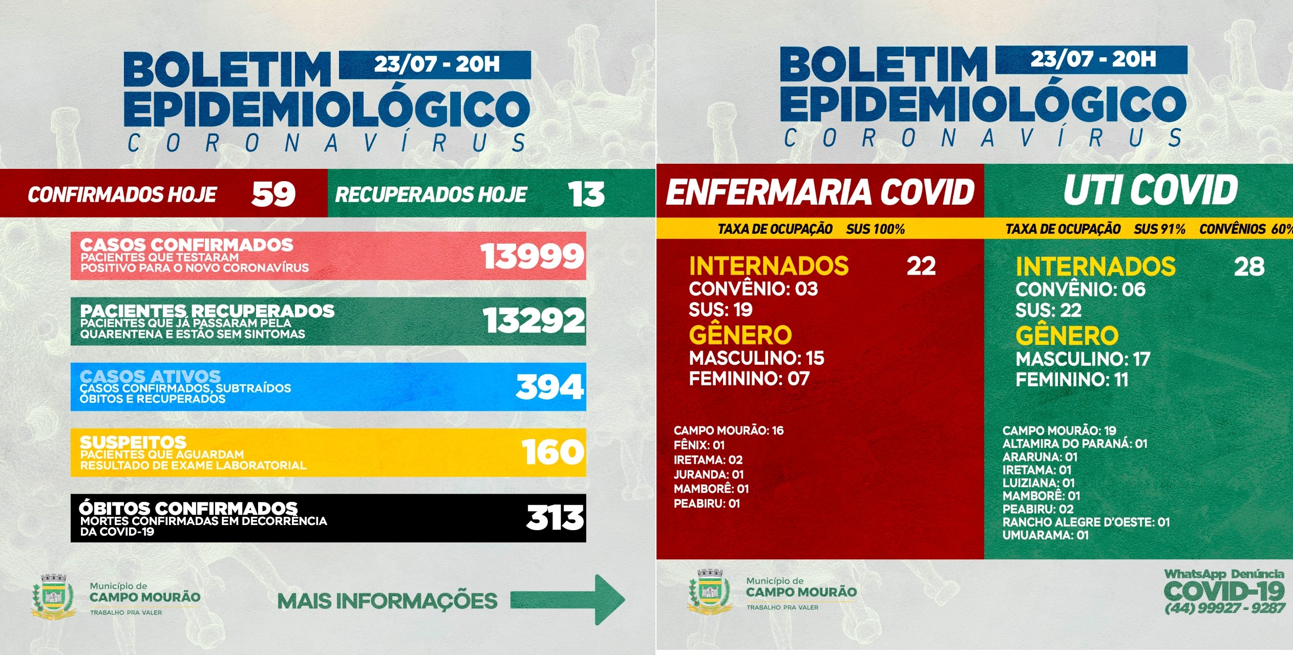 Campo Mourão teve 59 casos novos, totalizando 13999 casos de Covid-19 desde o início da pandemia. O número de suspeitos aumentou de 112 para 160 casos. As informações pertencem ao boletim da Secretaria da Saúde, divulgado nesta sexta-feira (23), às 21h30.