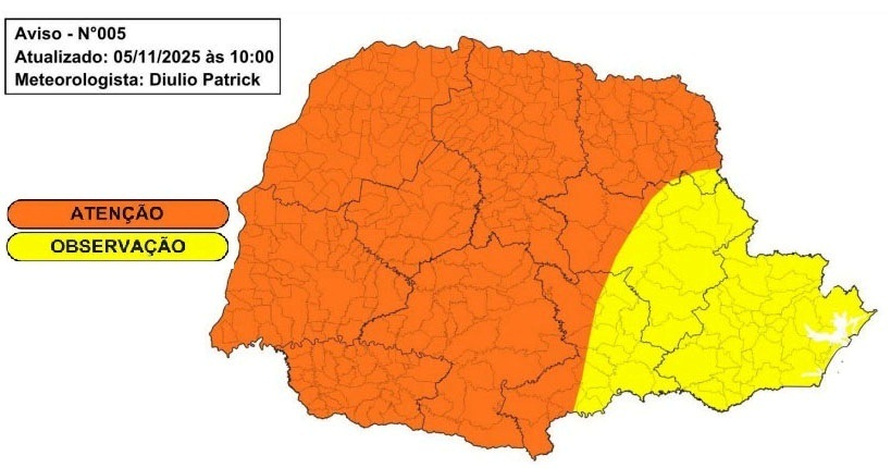 Na sexta-feira (07), entretanto, as chuvas voltam com intensidade ao Paraná. O boletim meteorológico do Simepar atualizado nesta quarta-feira em parceria com a Defesa Civil prevê uma área maior em atenção no Oeste, Noroeste, Sudoeste e parte do Norte do Estado.