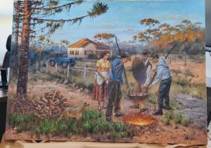 A obra “O Surgimento do Carneiro no Buraco”, pintada pelo artista Saulo Pfeiffer, foi entregue oficialmente nesta quinta-feira (18) à prefeitura de Campo Mourão em cerimônia no gabinete do prefeito Douglas Fabrício. O quadro em óleo sobre tela mostra a retirada do tacho do prato típico de Campo Mourão por pioneiros, numa paisagem da cidade quando a iguaria começou a ser preparada no início da década de 1960.