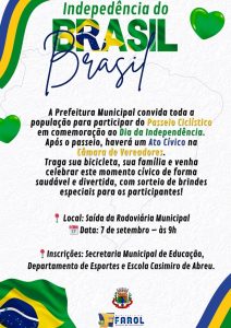 Despertando o civismo e comemorando o aniversário da Independência do Brasil, um passeio ciclístico deverá reunir as famílias de Farol no próximo, domingo 7 de setembro (Feriado Nacional). A programação do Município de Farol, através da Secretaria de Educação, Esporte e Cultura, terá início às 9 horas na Estação Rodoviária contando com sorteio de brindes e será encerrada com ato cívico na Avenida Paraná, em frente à Câmara Municipal.